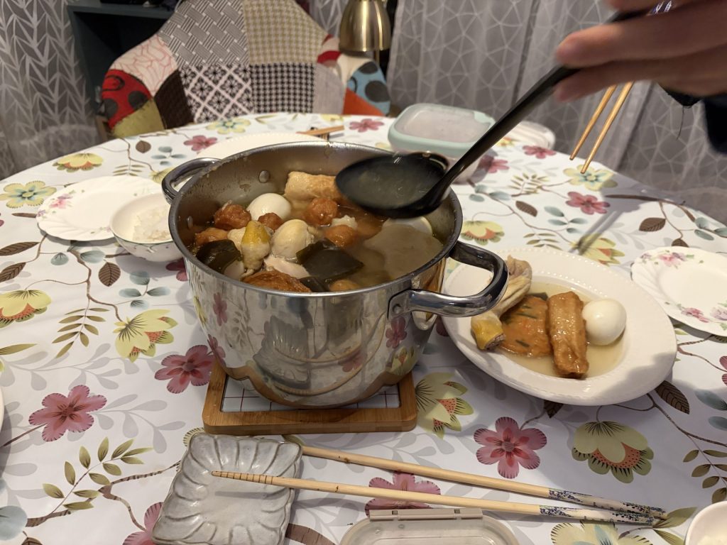 日本に住んでいた頃も、冬になるとよくおでんを作っていましたが、こちらでもおでんの具材(おでんのネタ)が手に入るので本当に嬉しいです。特に大根が大好きで、今日もたっぷり入れました。そして欠かせないのが卵。さらに、わが家のおでんには骨付きの鶏肉が入ります。じっくり煮込むと旨味が出て、とてもおいしい仕上がりになります。